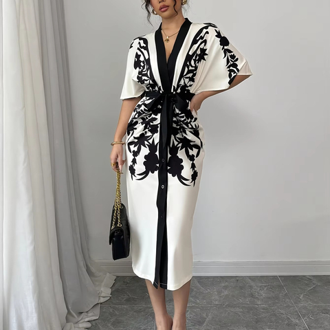 Women's Elegant V-Neck A-Line Midi Dress Half Sleeves Flower Printed Tied Waist Urban Office Style Button Decoration Natural